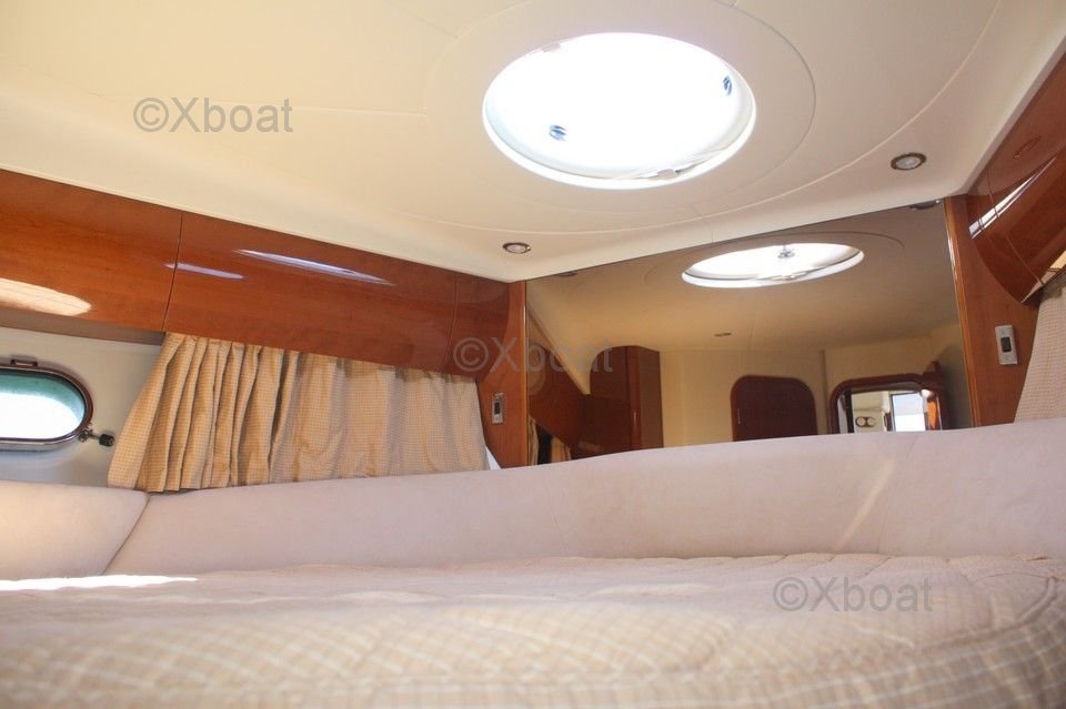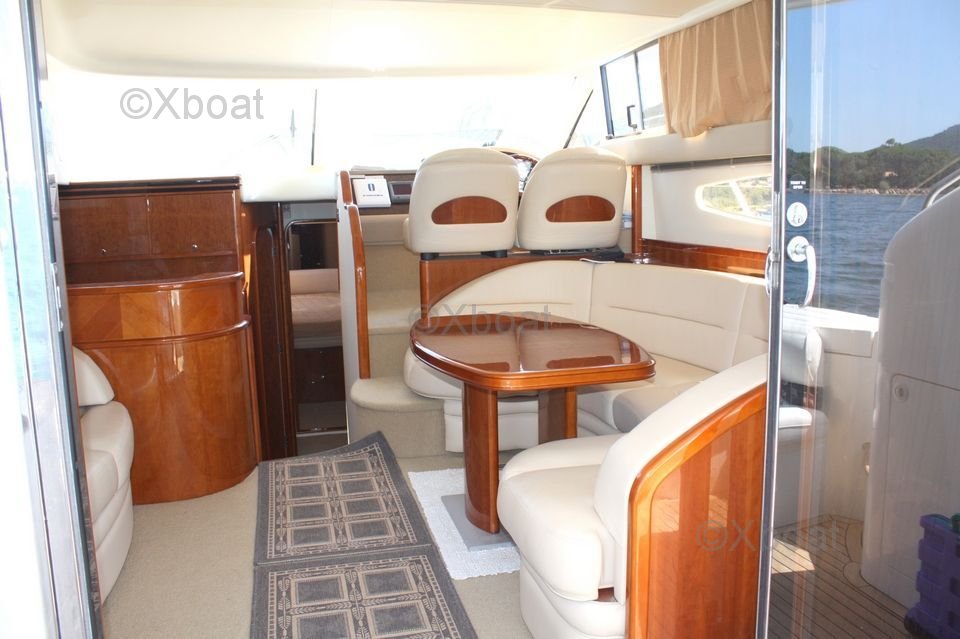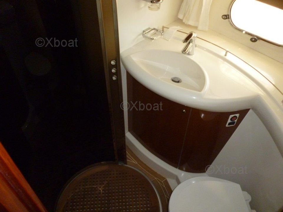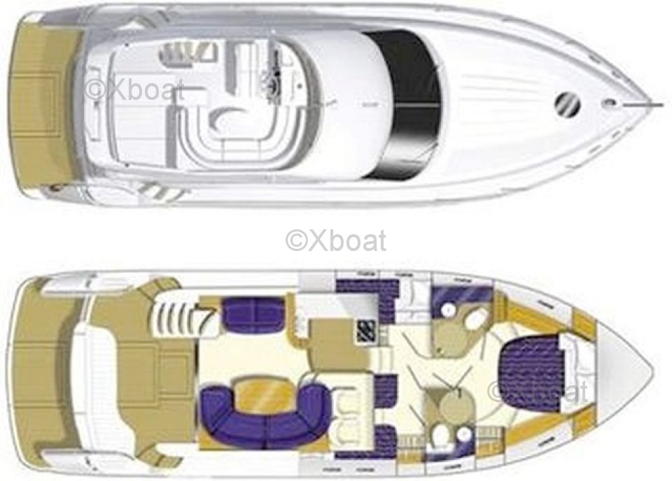 The upper deck is a true relaxation space, with an outdoor lounge and sunbathing area. The flybridge offers a panoramic view of the horizon, perfect for evenings at sea. The Princess 45 Fly also features three cabins, including a master suite with a private bathroom, providing optimal comfort for long voyages.