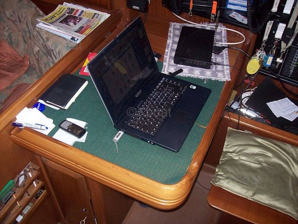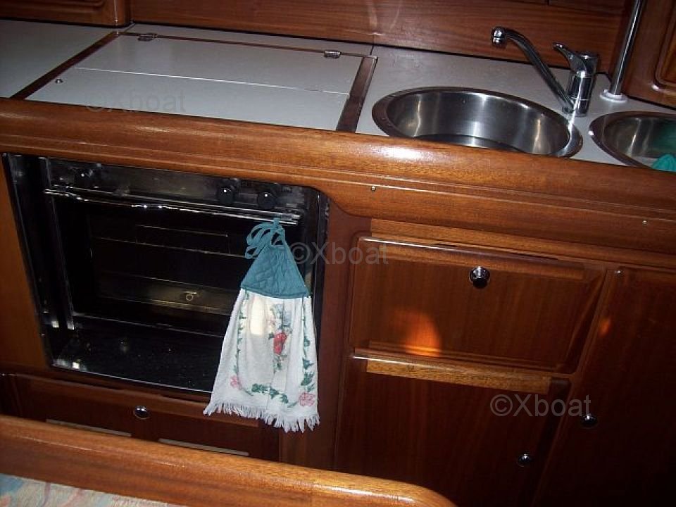 The interior of the boat is spacious and well-designed, with high-quality finishes. It features three double cabins, providing optimal comfort for long sailings. The kitchen is well-equipped, with a wooden countertop and abundant storage. The salon is bright thanks to large windows and offers a pleasant living space.