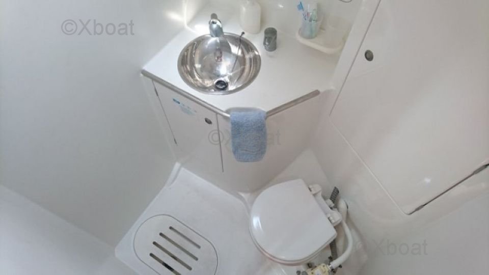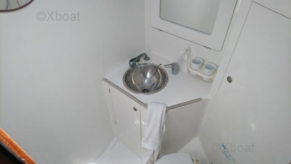 The cabins are comfortable with double beds and ample storage. The main cabin features a private bathroom with a separate shower.