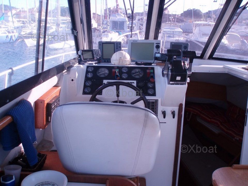 The cockpit is spacious and well-designed, with comfortable seats and a protected helm station. The flybridge offers a panoramic view and is equipped with seats to enjoy sea outings. The boat is also equipped with numerous fishing options, such as rod holders and storage compartments for gear.