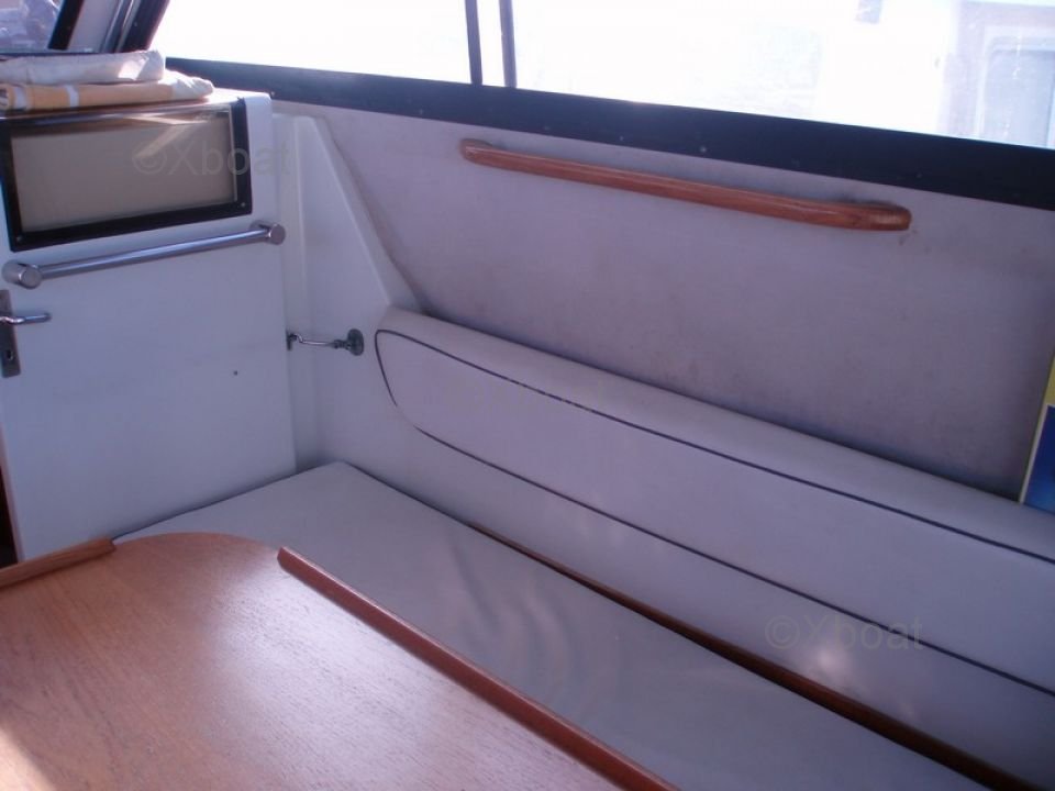 The interior of the Merry Fisher 930 Fly is designed to offer maximum comfort. It has two cabins, one at the front and one at the rear, accommodating up to 4 people for the night. The front cabin is equipped with two berths and the rear cabin with a double bed. The salon is spacious and bright, with a equipped kitchen and a complete bathroom.