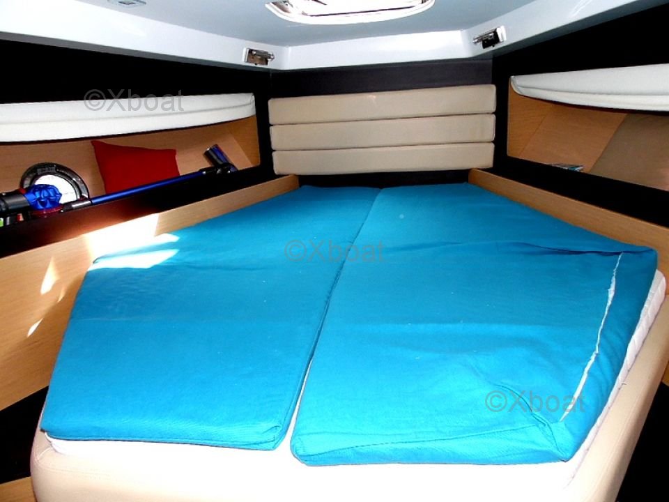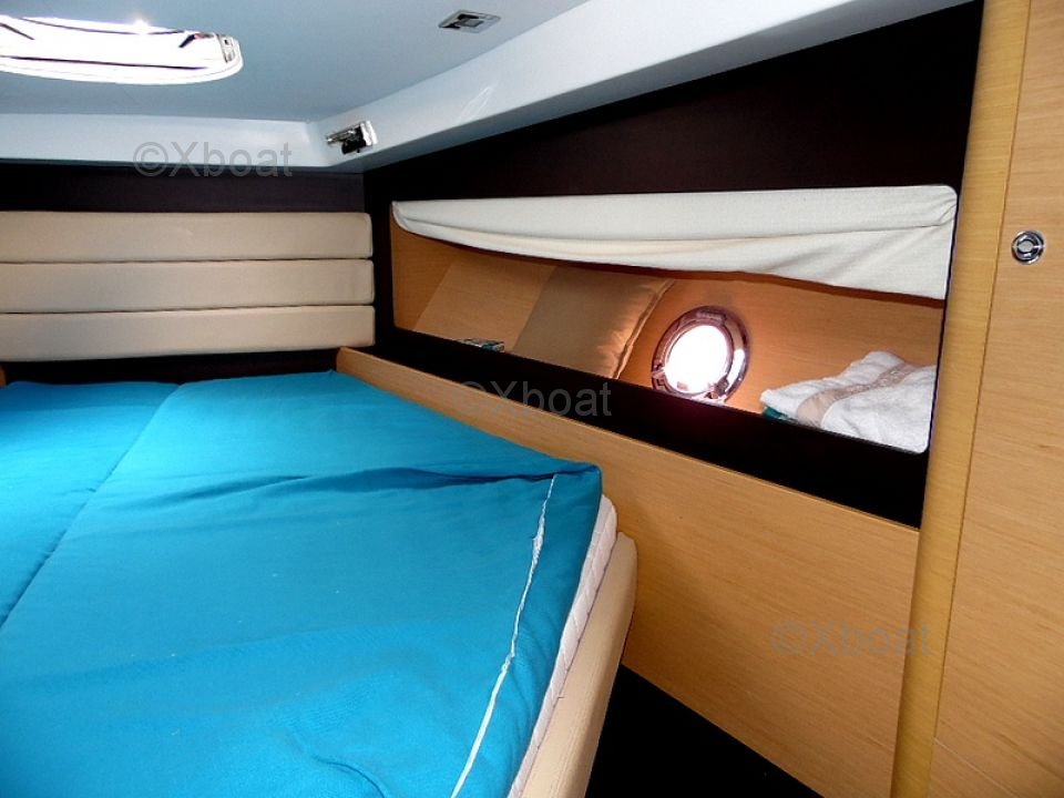 Interior Layout: The interior of the Monte Carlo 37 Open is spacious and bright, with high-quality finishes. It features two cabins, including a master cabin with a double bed and a guest cabin with bunk beds. The bathroom is equipped with a separate shower and an electric toilet.
