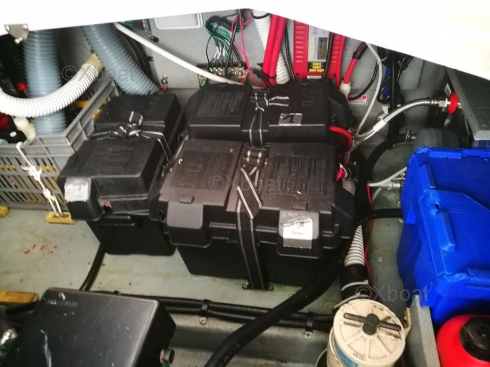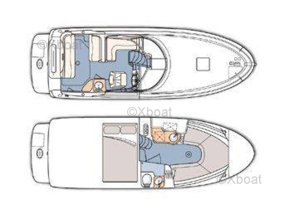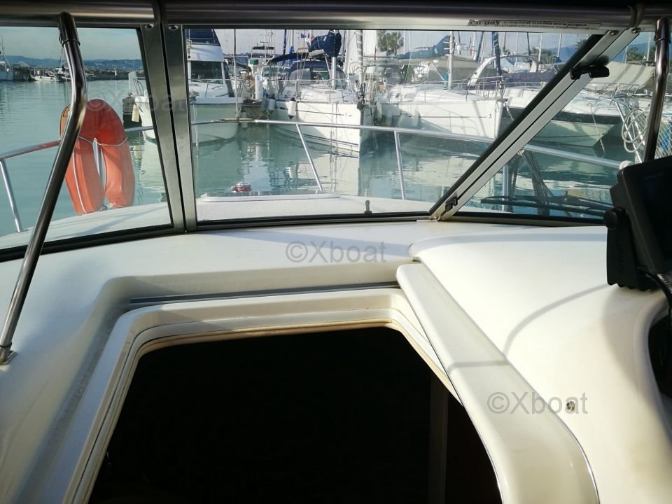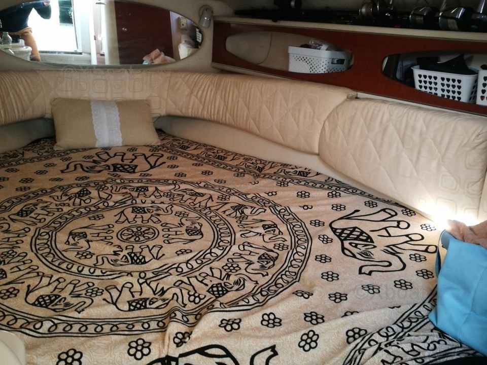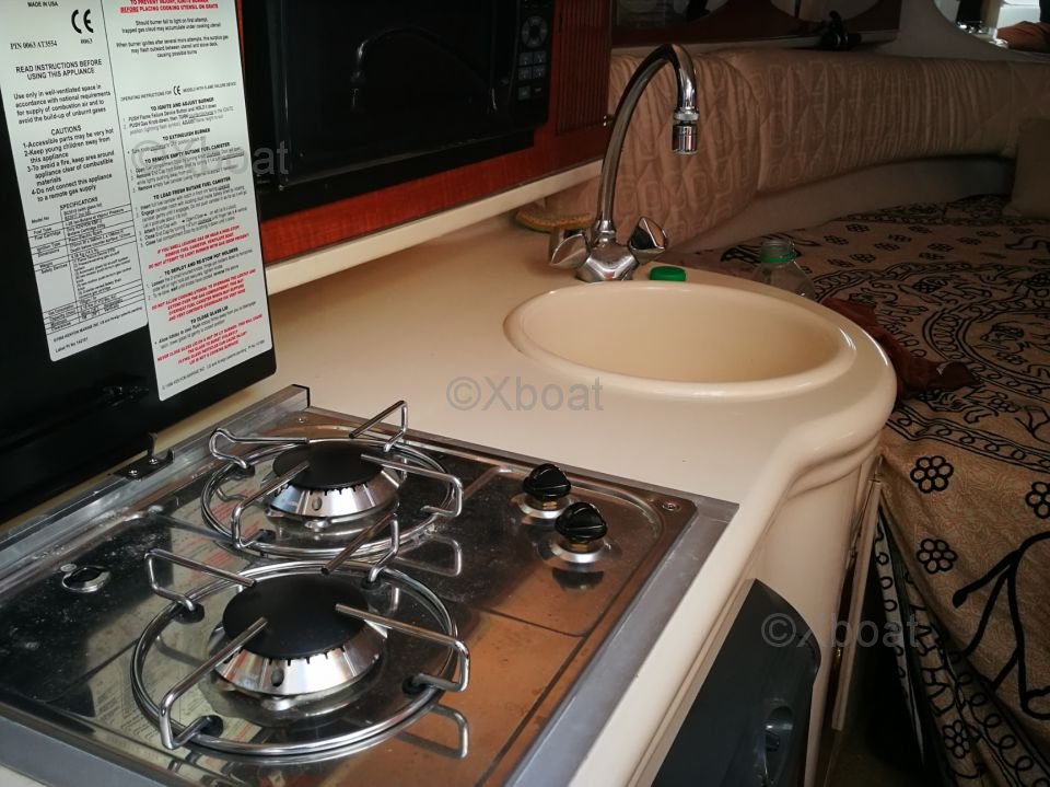 Deck Equipment: The fore deck offers a relaxation area with cushions and armrests. At the stern, a swim platform allows easy access to the water. The boat is also equipped with a canopy to protect the cockpit from the elements.