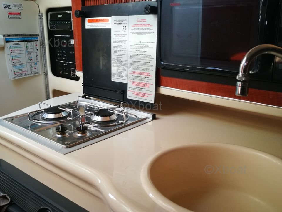 Comfort and Living Space: Inside, the boat features a spacious salon with convertible seating that can be transformed into a bed, providing sleeping accommodations for overnight stays. The kitchen is well-equipped with a sink, refrigerator, and a practical countertop. The bathroom includes a toilet, sink, and shower.