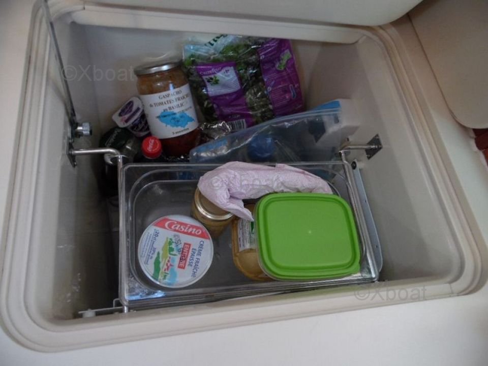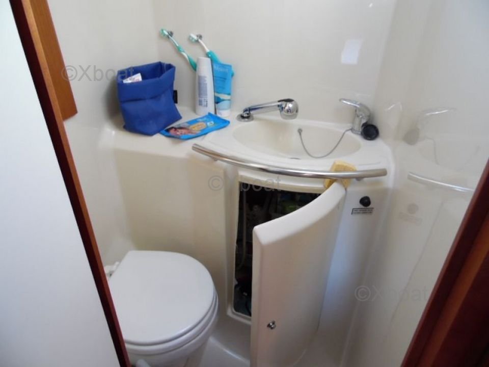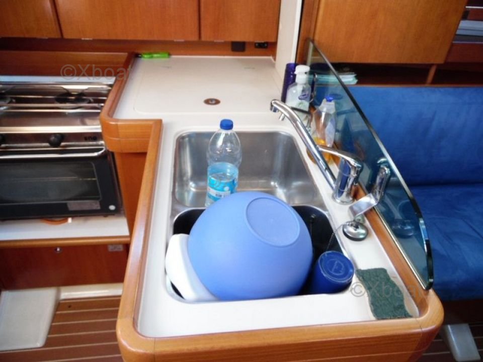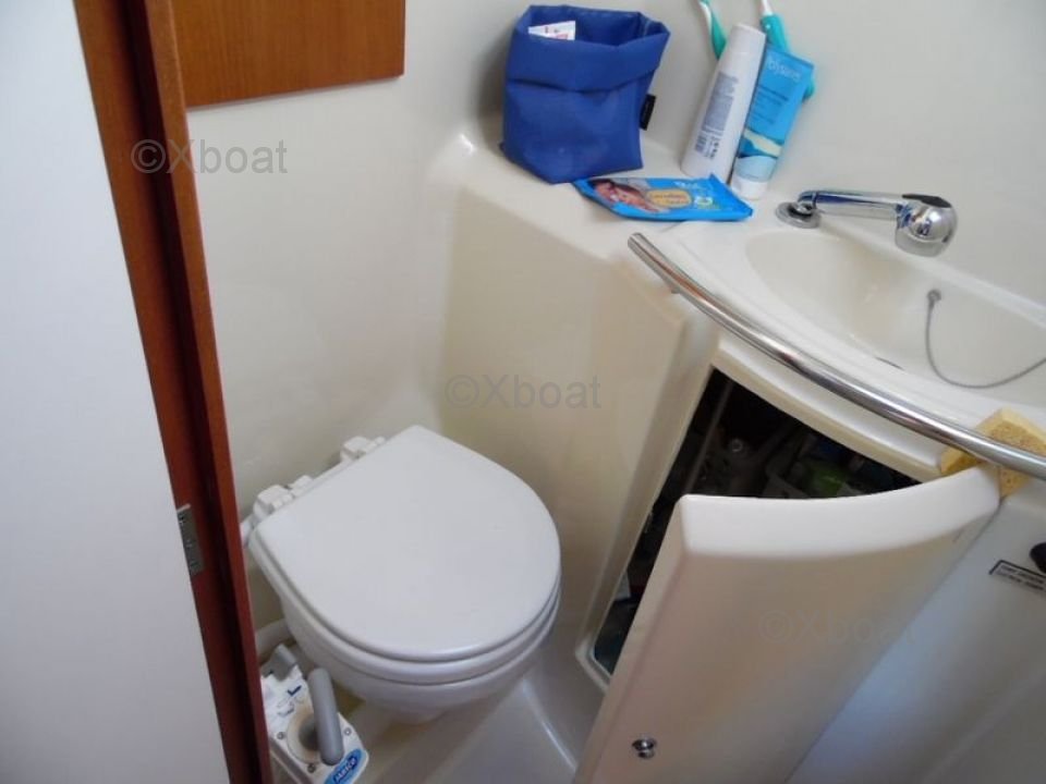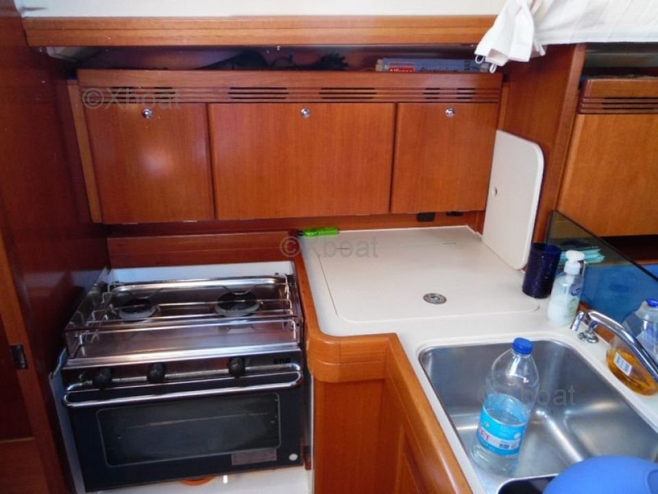 Inside, the Dufour 34 PTE offers a comfortable living space with high-quality finishes. The main cabin features two double berths, while the forward cabin offers a single berth. The galley is well-equipped with a sink, a refrigerator, and storage cabinets. The bathroom is spacious with a separate shower.