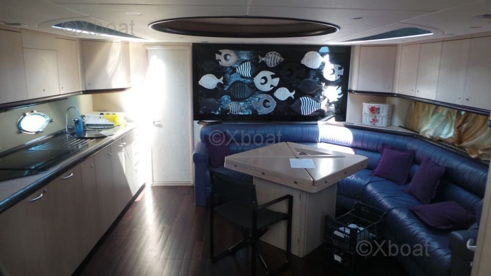 Outside, the Predator 68 features several relaxation areas, including a spacious cockpit and a flybridge equipped with seats and a dining table, perfect for outdoor meals and relaxation. The boat is also equipped with all the necessary amenities for sailing, including an advanced navigation system and state-of-the-art safety equipment.