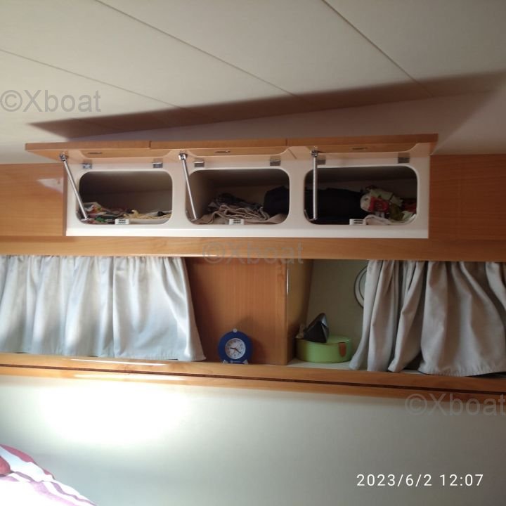 The headroom in the salon is 1.95 meters, offering a spacious and comfortable living space. The cabins also benefit from a headroom of 1.90 meters, ensuring a pleasant stay on board.