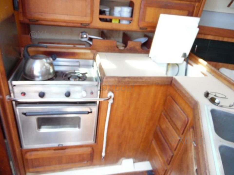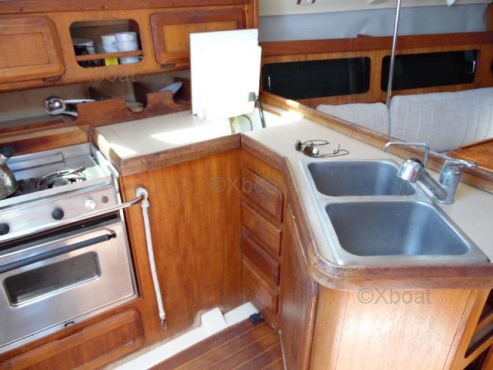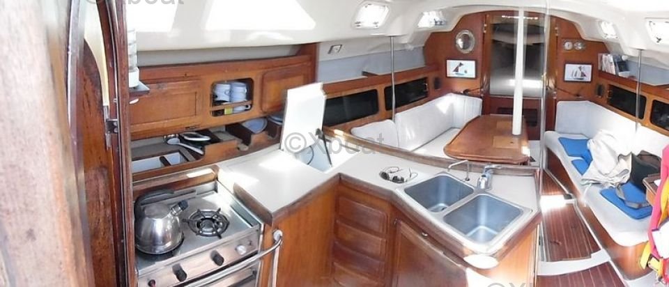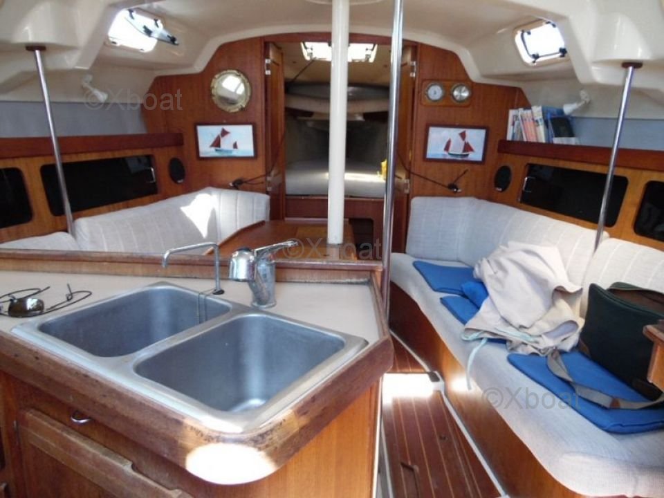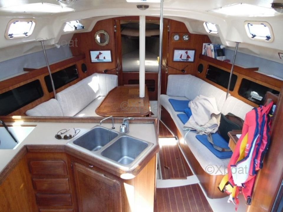 The interior of the Hunter Legend 35.5 is spacious and well-designed, with a comfortable main cabin and accommodation for up to six people. The galley is well-equipped, with a stainless steel sink, a refrigerator, and a gas stove. The head is separate and includes a sink and a water tank.