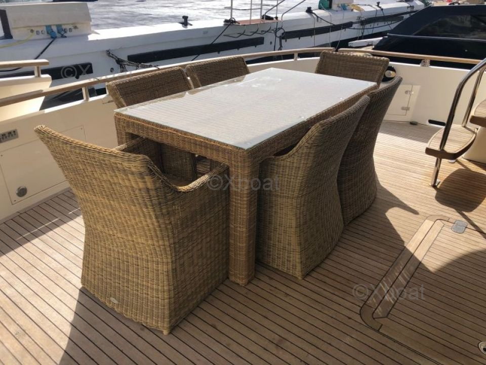 Deck and exterior: The main deck is designed to offer a spacious outdoor living area, with relaxation zones, an outdoor bar, and often a jacuzzi. The flybridge offers a breathtaking panoramic view, ideal for sea outings and starry nights.