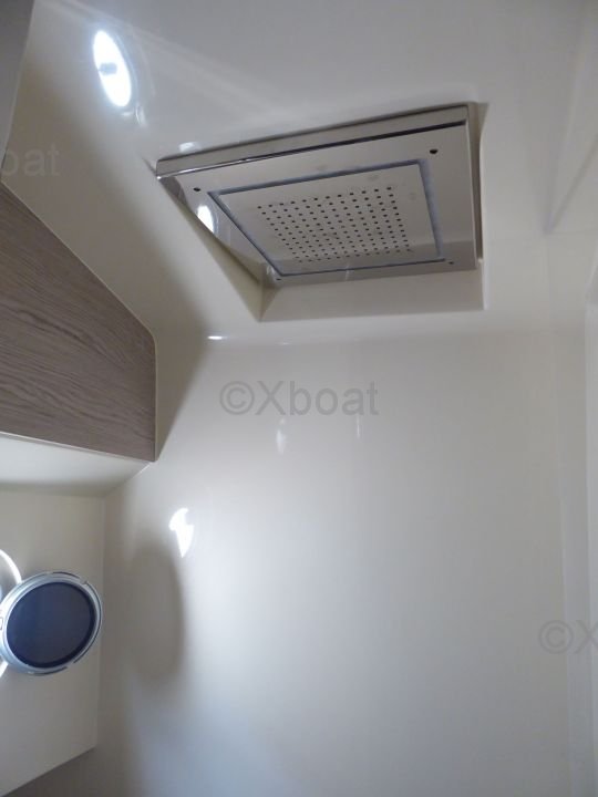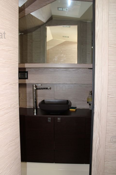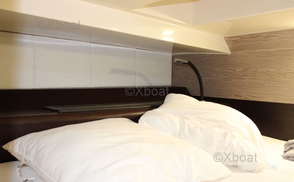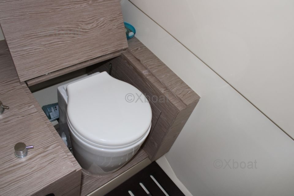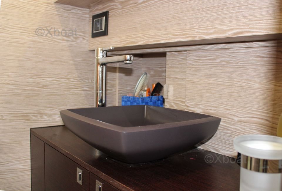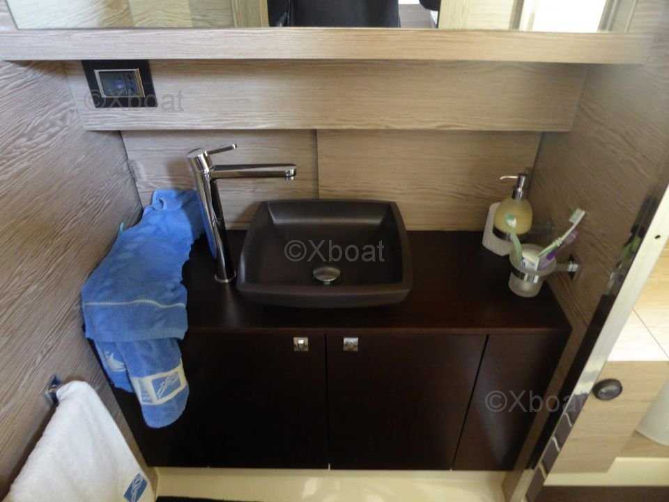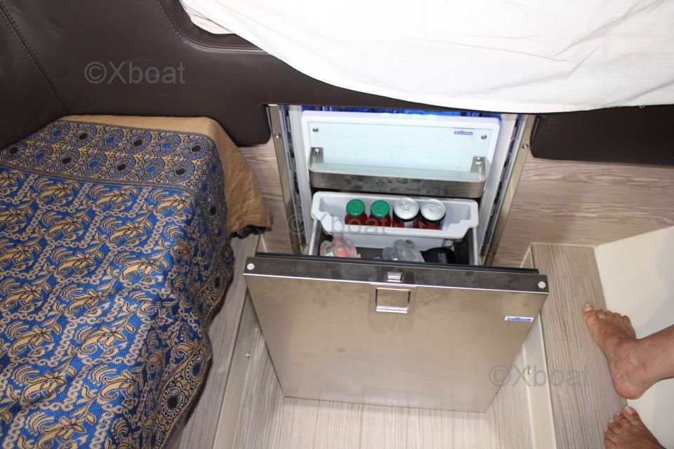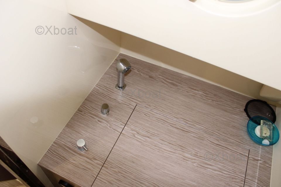 This sailboat features three double cabins, providing spacious and comfortable living space for up to six people. The kitchen is well-equipped with a refrigerator, sink, and stainless steel countertop. The bathroom includes a separate shower and electric toilets.