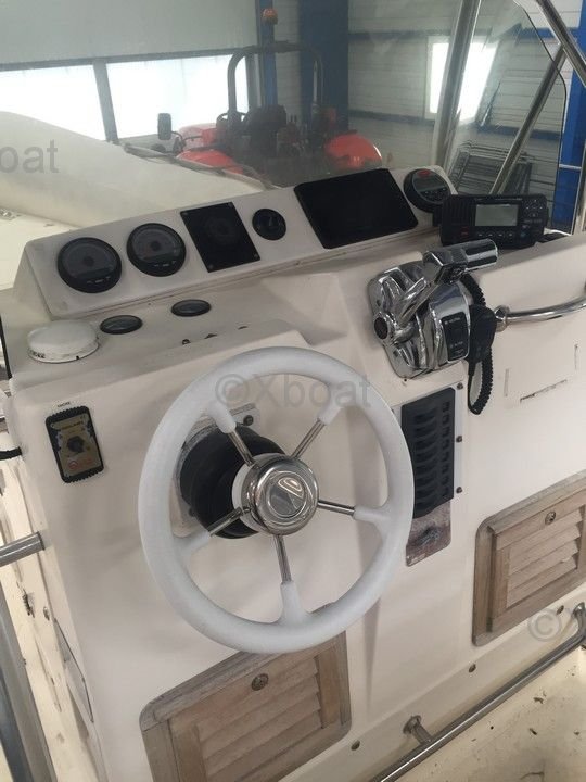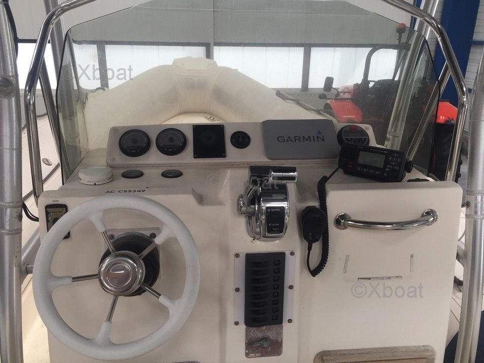 The CLUBMAN 26 is interesting for several reasons. First, its large aft sunbed with fold-down backrest offers optimal comfort for sunny days. Then, its helm station with ergonomic seat ensures comfortable and safe driving. Moreover, the console with front seat and storage allows you to enjoy the space on board while keeping all your equipment within reach. Finally, the recent upgrades such as the new Garmin Echomap GPS fishfinder combo and the new speakers (Fusion EL-F651W) add a modern and practical touch to this already performing semi-rigid.
