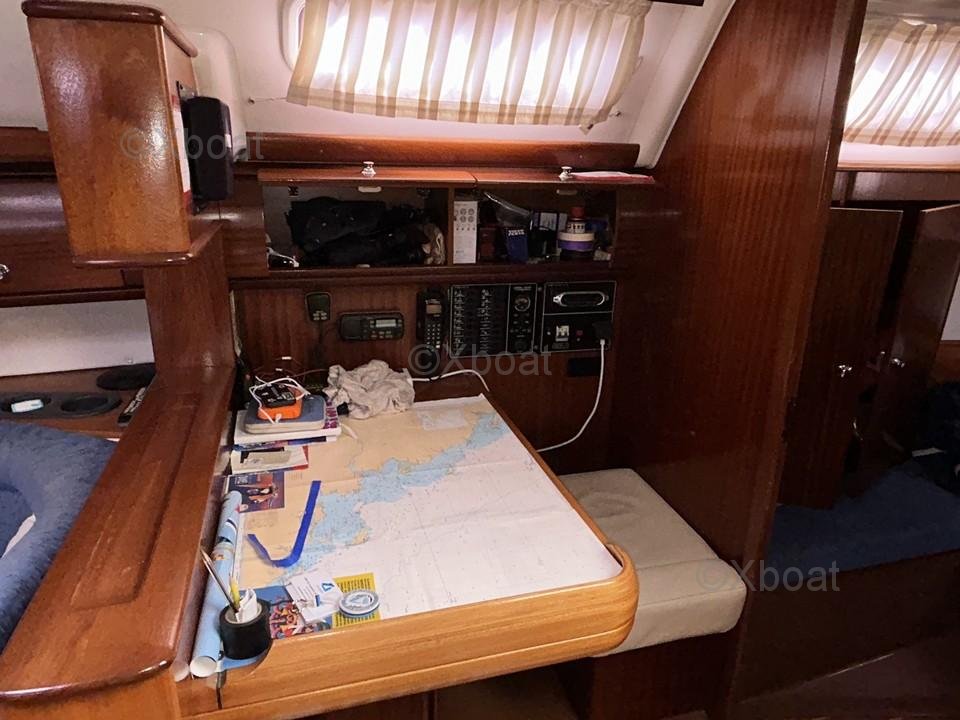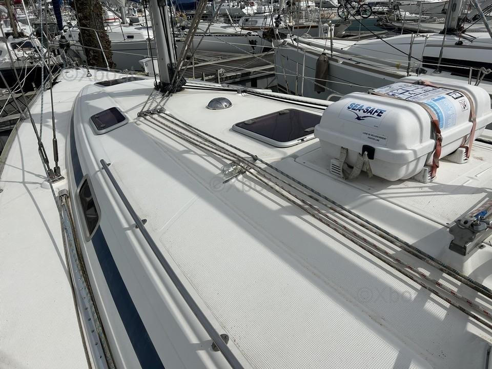 Le bateau est équipé d’un radeau de survie Sea Safe hauturier 6 places, révisé en 2025. Le cockpit en teck apporte une touche esthétique et un confort supplémentaire. Le taud de bimini et la capote de descente sont en bon état, offrant une protection efficace contre les intempéries.